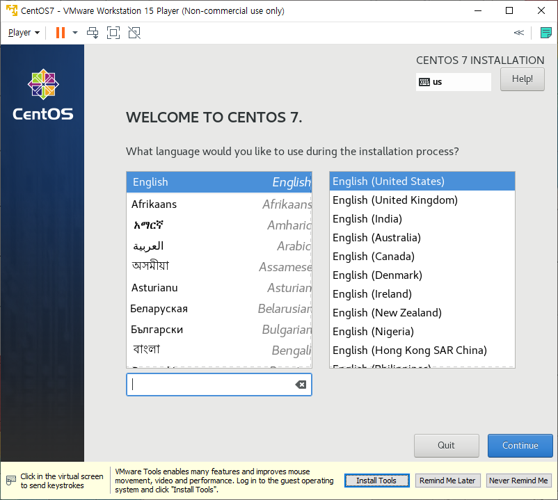 Install CentOS 7를 선택하거나 ctrl + i 후에 Enter를 누르면 설치가 시작된다.