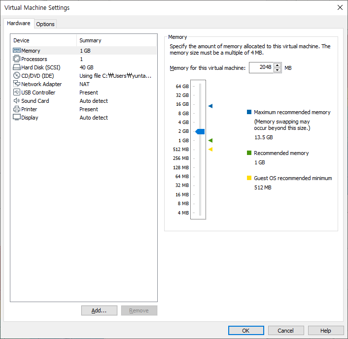 내가 생성한 가상머신의 환경을 설정할 수 있다. 일단 Memory를 2GB(2048MB)로 설정한 뒤 OK를 누른다.