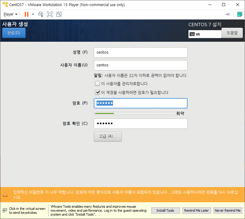 완료를 누르면 비밀번호가 너무 약하다는데 연습용 계정이니 신경쓰지말고 다시 완료를 누르면 사용자가 생성된다.