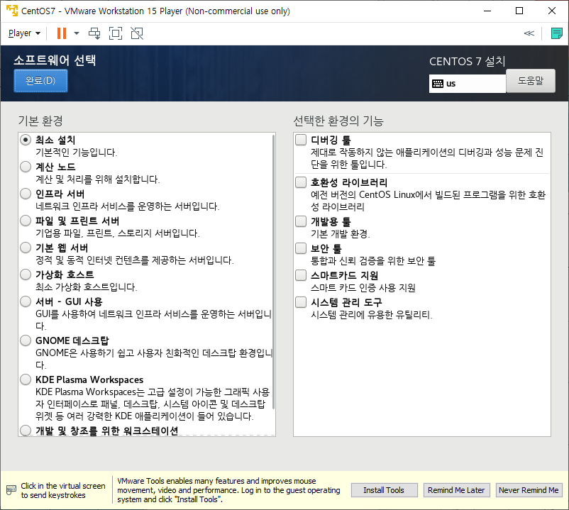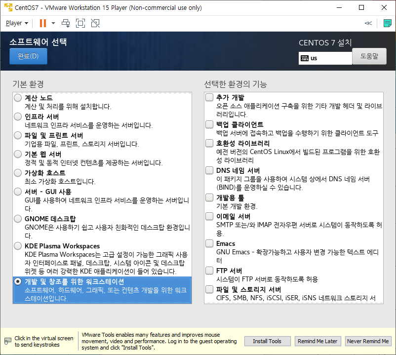 이것을 개발 및 창조를 위한 워크스테이션 으로 바꾼 후 왼쪽 위에 완료를 누른다.
