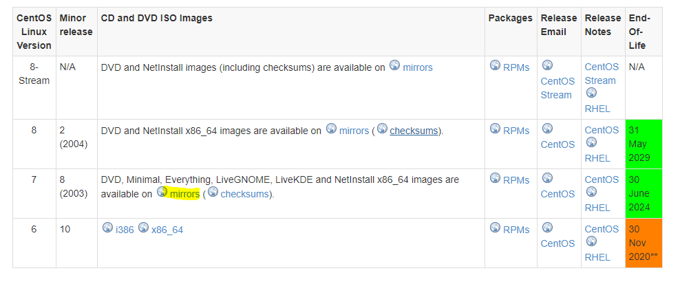 들어가면 표가 하나 나오는데 7버전쪽에 mirrors를 클릭한다.