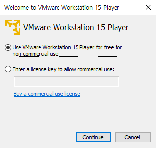 시리얼키 없이 무료 버전을 이용할거냐고 묻는다. Continue
