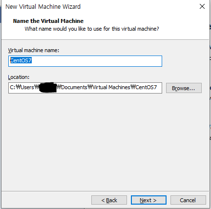 설치할 가상머신의 이름과 저장장소를 고르란다. 나는 이름을 CentOS7로 바꾸고 Next를 눌렀다.