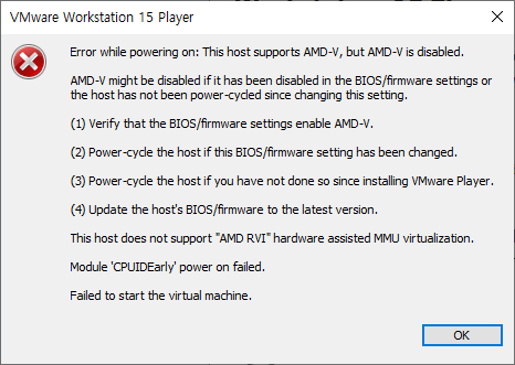 바이오스에서 가상화 SVM을 활성화해야한다. 메인보드 제조사에 따라 바이오스에 들어가는 키가 다르고