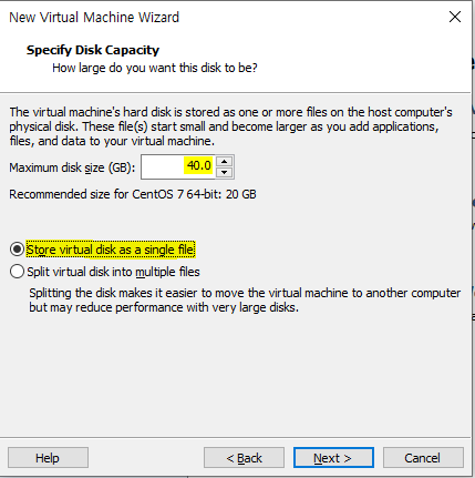 그림대로 40GB에 한 파일에 저장하기를 누르고 Next를 누르면 된다.