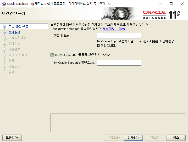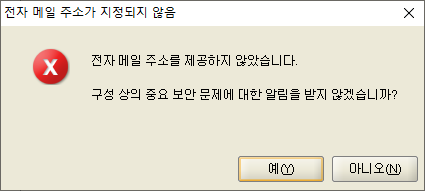 설치 단계에 들어가면 가장 먼저 보안 알림을 받을 메일 주소를 입력하는데 저는 패스하겠습니다.