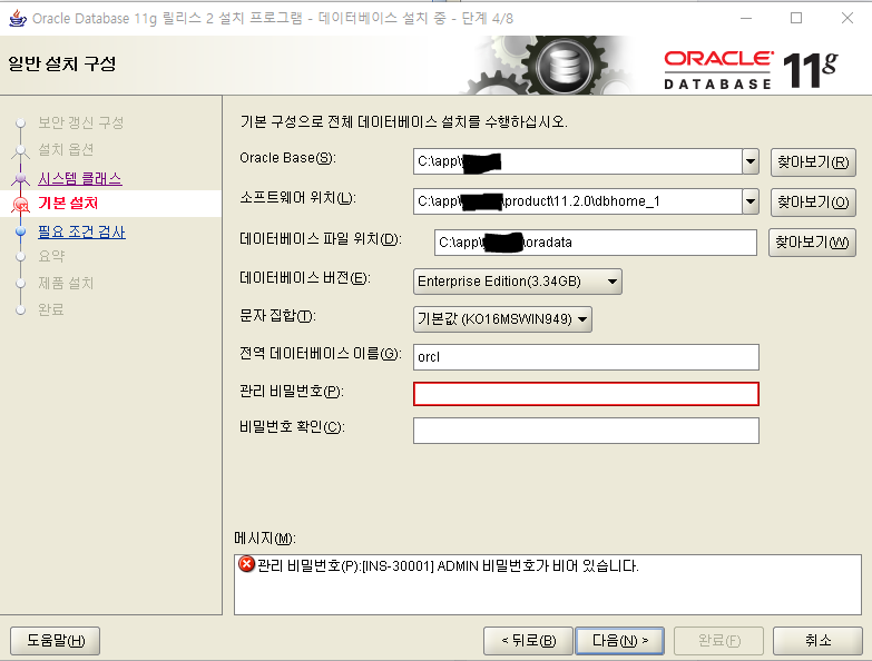 Window 64bit Oracle 11g 를 설치하는 과정입니다.