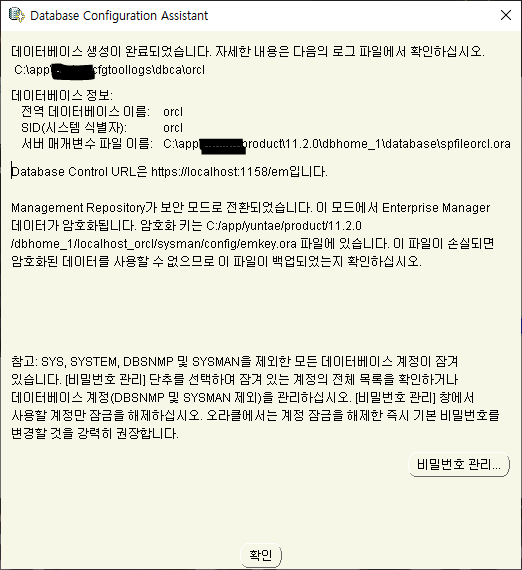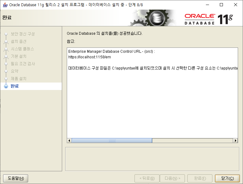 오라클(Oracle) 11g 버전 설치가 끝났습니다.