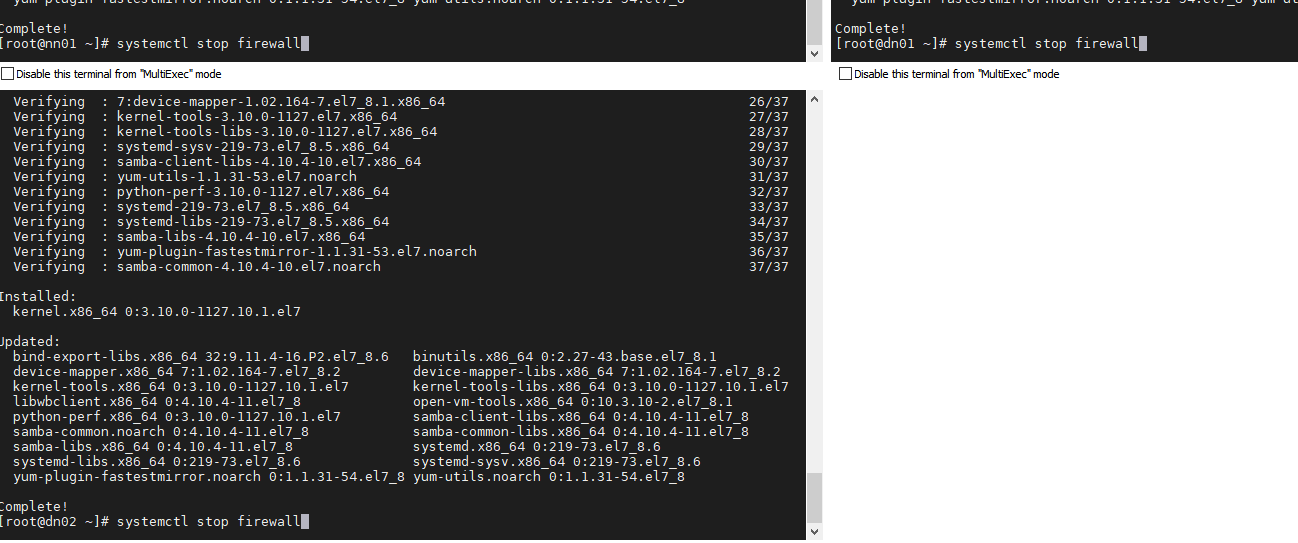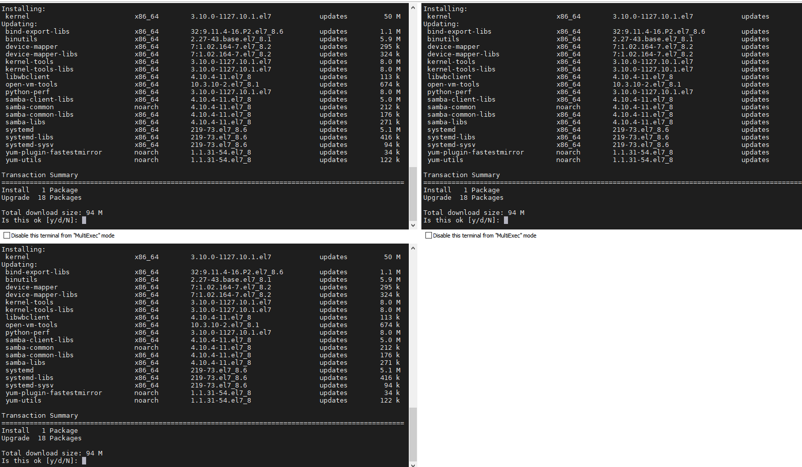 3개의 창에 yum update 실행