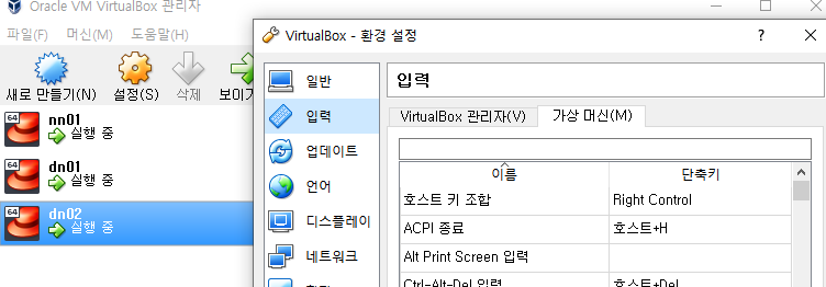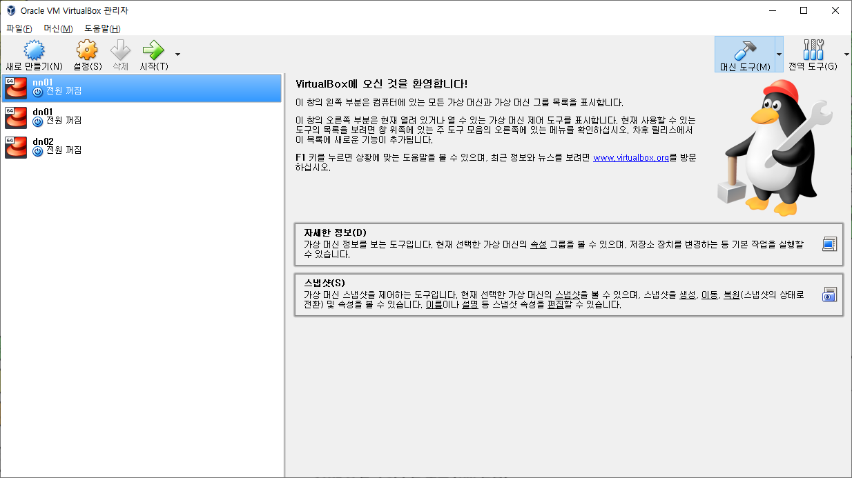 3개의 가상장치를 nn01,dn01,dn02로 Save한다.