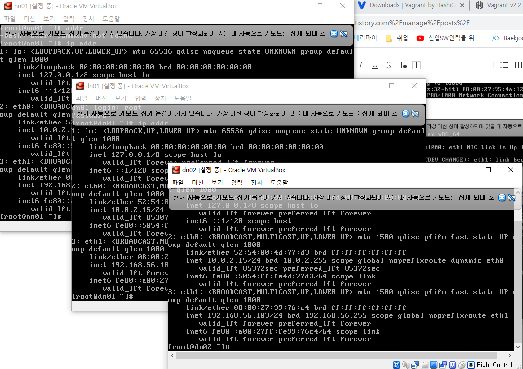 3개의 가상머신 모두 ip addr로 아이피 확인