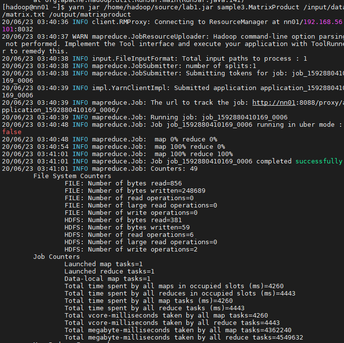 # yarn jar /home/hadoop/source/lab1.jar sample3.MatrixProduct /input/data/matrix.txt /output/matrixproduct