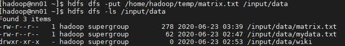 # hdfs dfs -put /home/hadoop/temp/matrix.txt /input/data