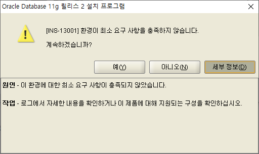 - 오라클(Oracle) 11g [INS-13001]환경이 최소 요구사항을 충족하지 않습니다.2020년 06월 14일