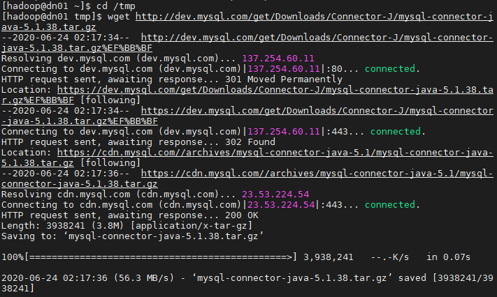 [hadoop@dn01 tmp]# wget http://dev.mysql.com/get/Downloads/Connector-J/mysql-connector-java-5.1.38.tar.gz