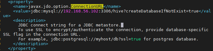 <value>jdbc:mysql://192.168.56.102:3306/hive?createDatabaseIfNotExist=true</value>