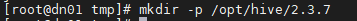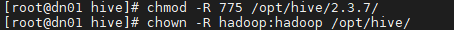 [root@dn01 ~]# chmod -R 775 /opt/hive/2.3.7/[root@dn01 ~]# chown -R hadoop:hadoop /opt/hive/