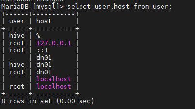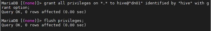 > grant all privileges on *.* to hive@"dn01" identified by "hive" with grant option;