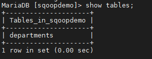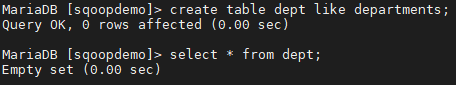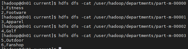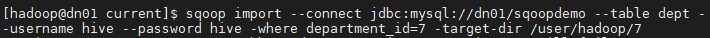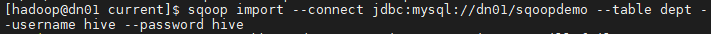 sqoop import --connect jdbc:mysql://dn01/sqoopdemo --table departments --username hive --password hive