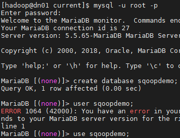 > create database sqoopdemo;