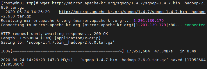 # wget http://mirror.apache-kr.org/sqoop/1.4.7/sqoop-1.4.7.bin__hadoop-2.6.0.tar.gz