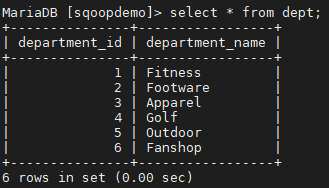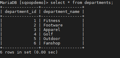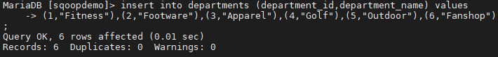 (1,"Fitness"),(2,"Footware"),(3,"Apparel"),(4,"Golf"),(5,"Outdoor"),(6,"Fanshop");