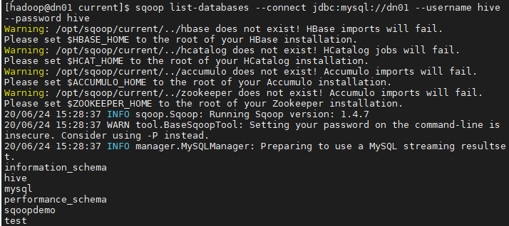 sqoop list-databases --connect jdbc:mysql://dn01 --username hive --password hive