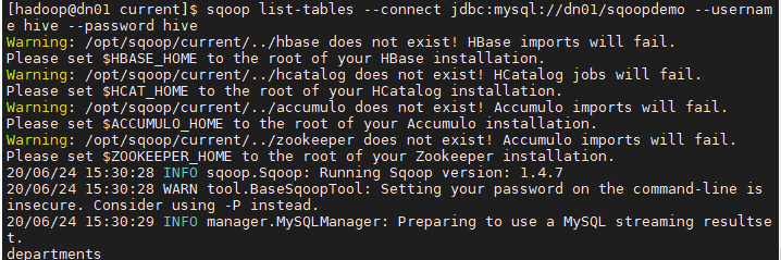 sqoop list-tables --connect jdbc:mysql://dn01/sqoopdemo --username hive --password hive