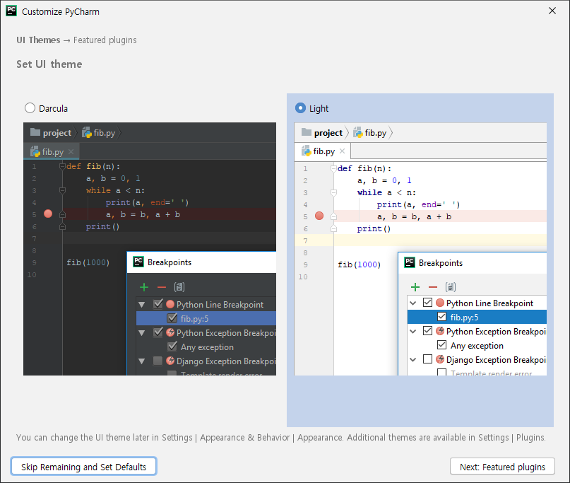 그럼 UI를 선택하게 되는데 나는 밝은게 좋아 Light테마를 사용한다. 나중에 바꿀 수 있으니 상관없다.