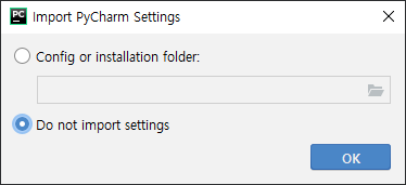 재부팅 후 파이참을 실행시키면 설정 정보를 불러올 지 선택한다. 없으므로 Do not import settings를 선택한다.