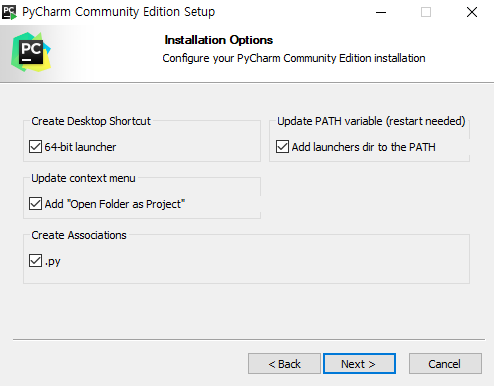 하단은 파이썬 확장자 .py를 프로그램에 연결할 지 선택한다. 나는 전부 선택 후 next를 눌렀다.