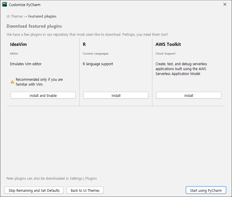추가적인 플러그인 설치 화면이다. 필요한 플러그인들을 install하고 start using pycharm을 누른다.