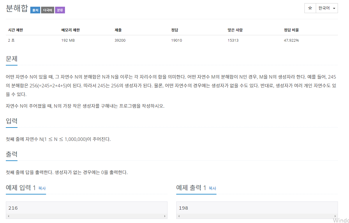 백준 알고리즘 2231번 문제 분해합구하기 2231번 문제 분해합 구하기이다.