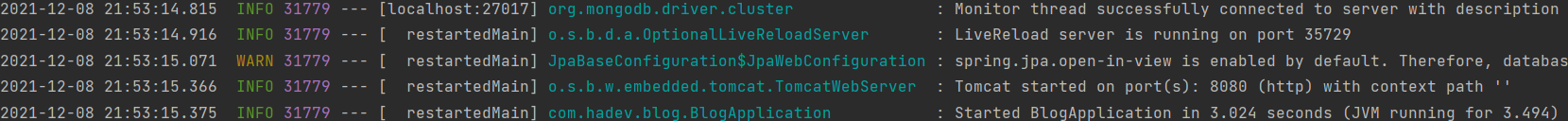 spring: jpa: hibernate: ddl-auto: update show-sql: true datasource: url: jdbc:mysql://127.0.0.1:3306/{DB명}?characterEncoding=UTF-8&serverTimezone=UTC username: {유저명} password: {유저패스워드} driver-class-name: org.mariadb.jdbc.Driver이후 SpringBootApplication 을 실행시켜본다.
