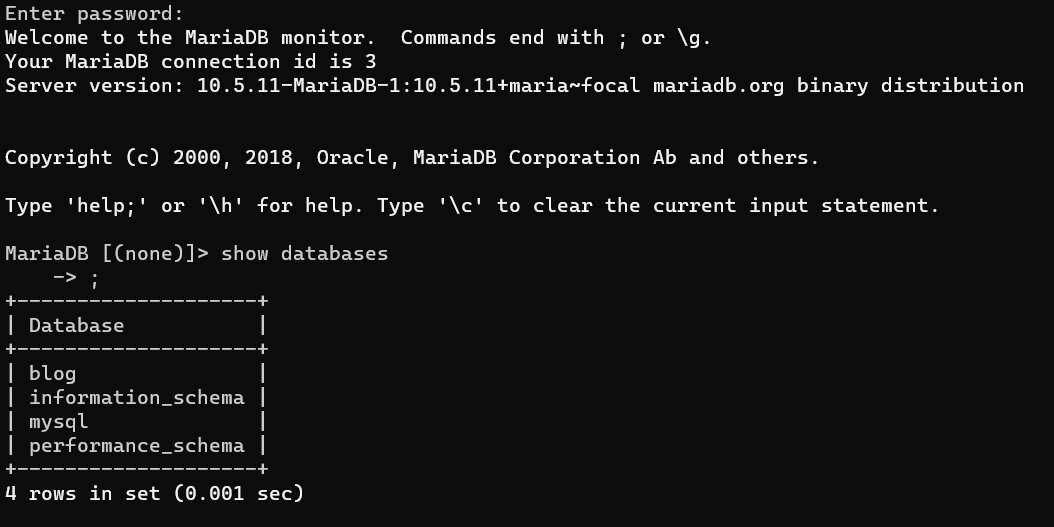 # mariadb -h 127.0.0.1 -p 3306 -u root -p