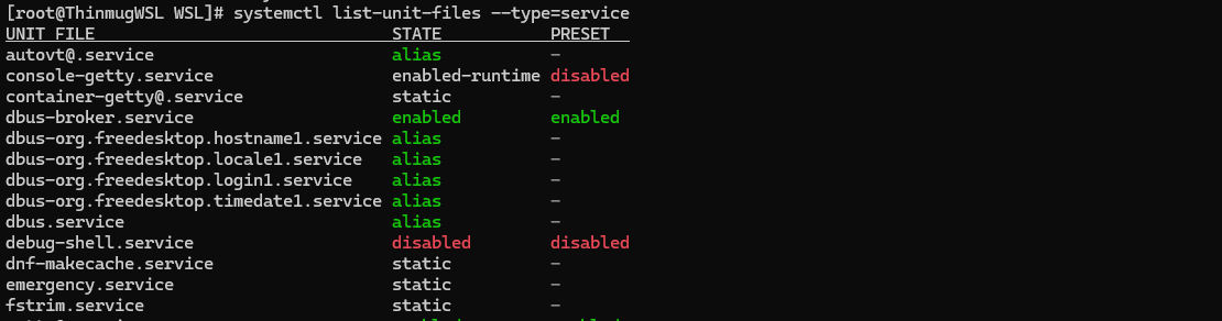 hostname이 ThingmugWSL로 변경되었다. systemctl list-unit-files --type=service
