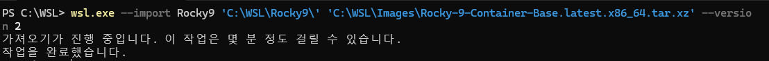 wsl.exe --import <배포판명> <저장할위치> <다운받았던 이미지파일위치> --version 2명령어로 이미지를 설치한다.
