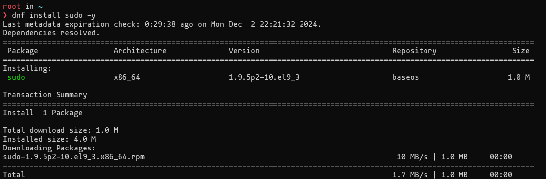 dnf install sudo -y로 sudo 패키지를 설치한다.
