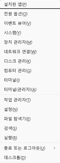 Win Key + X로 퀵링크를 열고 터미널(관리자)를 클릭하여 관리자권한이 있는 터미널을 연다.