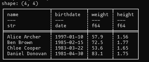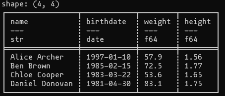 import polars as pl import datetime as dt df = pl.DataFrame( { "name": ["Alice Archer", "Ben Brown", "Chloe Cooper", "Daniel Donovan"], "birthdate": [ dt.date(1997, 1, 10), dt.date(1985, 2, 15), dt.date(1983, 3, 22), dt.date(1981, 4, 30), ], "weight": [57.9, 72.5, 53.6, 83.1], # (kg) "height": [1.56, 1.77, 1.65, 1.75], # (m) } ) print(df)