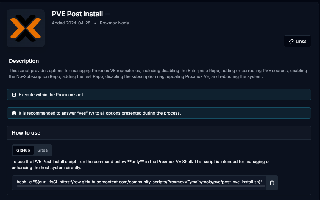 Proxmox VE helper-scripts github 블로그 이 중 PVE Post Install이라는 스크립트는 스크립트 실행 시 각종 enterprise의 비활성화 및 구독알림 제거, 시스템 업데이트를 제공한다.