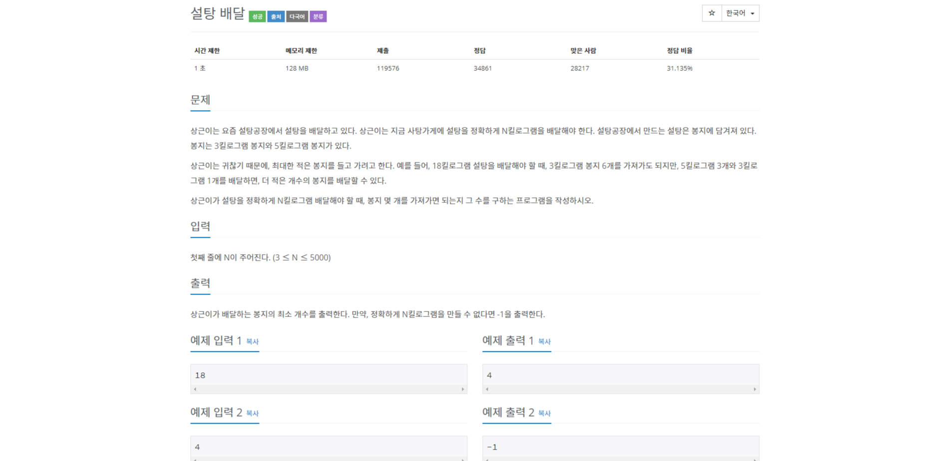 설탕을 배달하는데 3킬로그램 봉지와 5킬로그램 봉지에 딱맞게 최소한의 봉투로 담고싶단다.